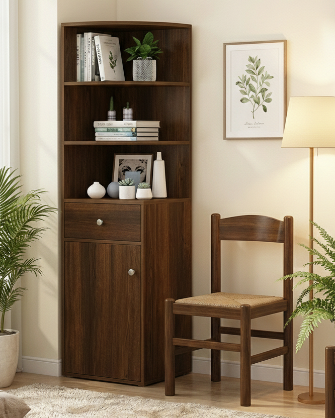 Make the most of unused corners with this elegant wooden corner cabinet designed for smart storage and display. Featuring open shelves for books, décor, and plants along with a closed drawer cabinet for concealed storage, it helps keep your space organised and clutter-free.